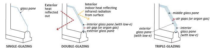 There are commonly three types of glazing to choose from. There’s no right choice, but rather the best choice in regards to your preference, budget, and/or home project goals. Choosing specific types of glazing will make a difference in how much you could increase energy efficiency in your home. The type of glazing you choose will provide different levels of heat retention or prevent it from coming in, as well as have varying impacts on daytime lighting, noise control, maintenance and security.